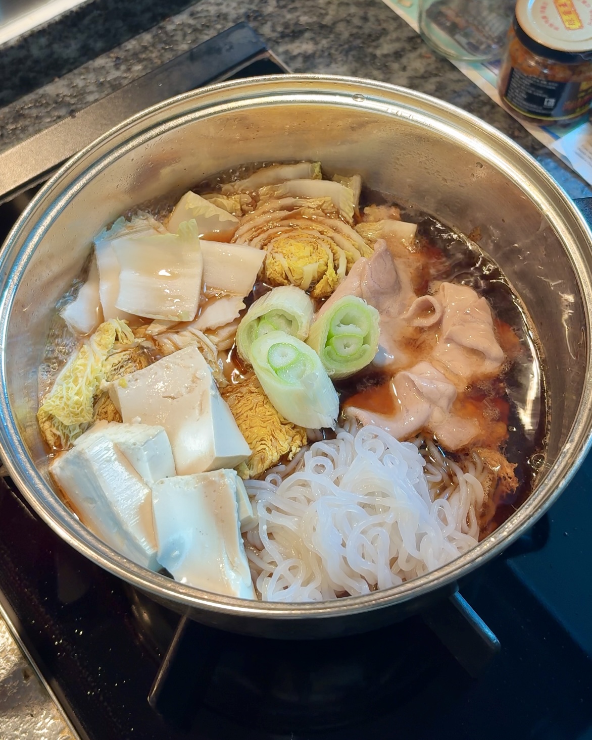 - To make the sukiyaki sauce, combine 2 tablespoons mirin, 2 tablespoons light soy sauce, 1 teaspoon sugar, 2 tablespoons water. Pour it into the pot and add an additional 1 cup of water. Bring to a boil and let it simmer for 2-3 minutes.